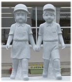 海に近い高台にある磯部小学校の校門前には、男女児童の石像。